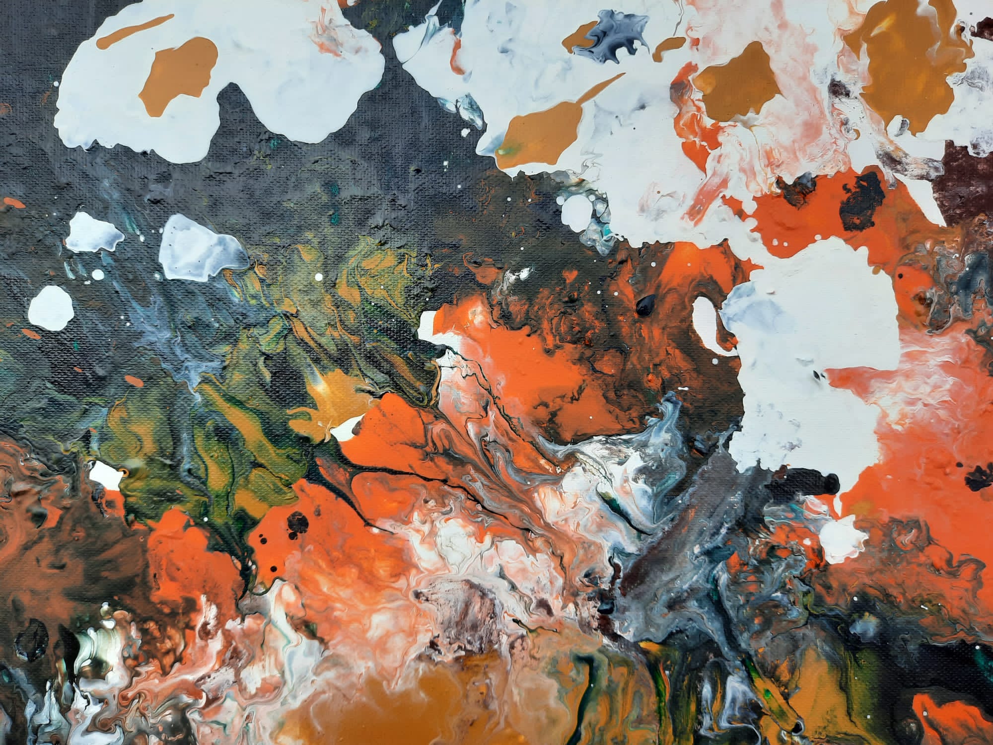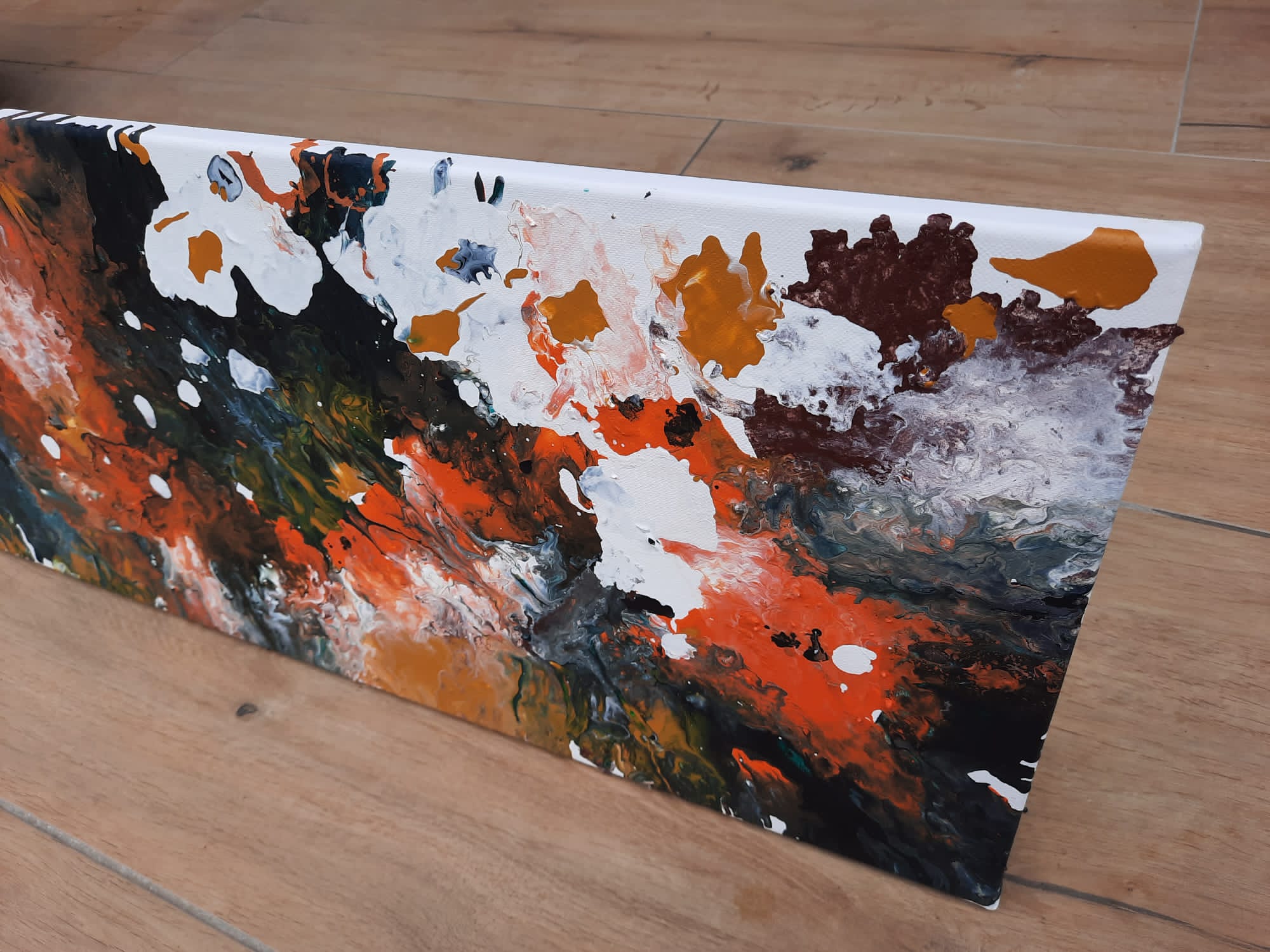 AUTUMN LOVER vereint die herbstlichen Töne des Waldes in einer aufregenden Farbkomposition. Weiße Akzente brechen durch dunkel gehaltene Acrylschichten und erzeugen ein kontrastreiches Farbspektrum.