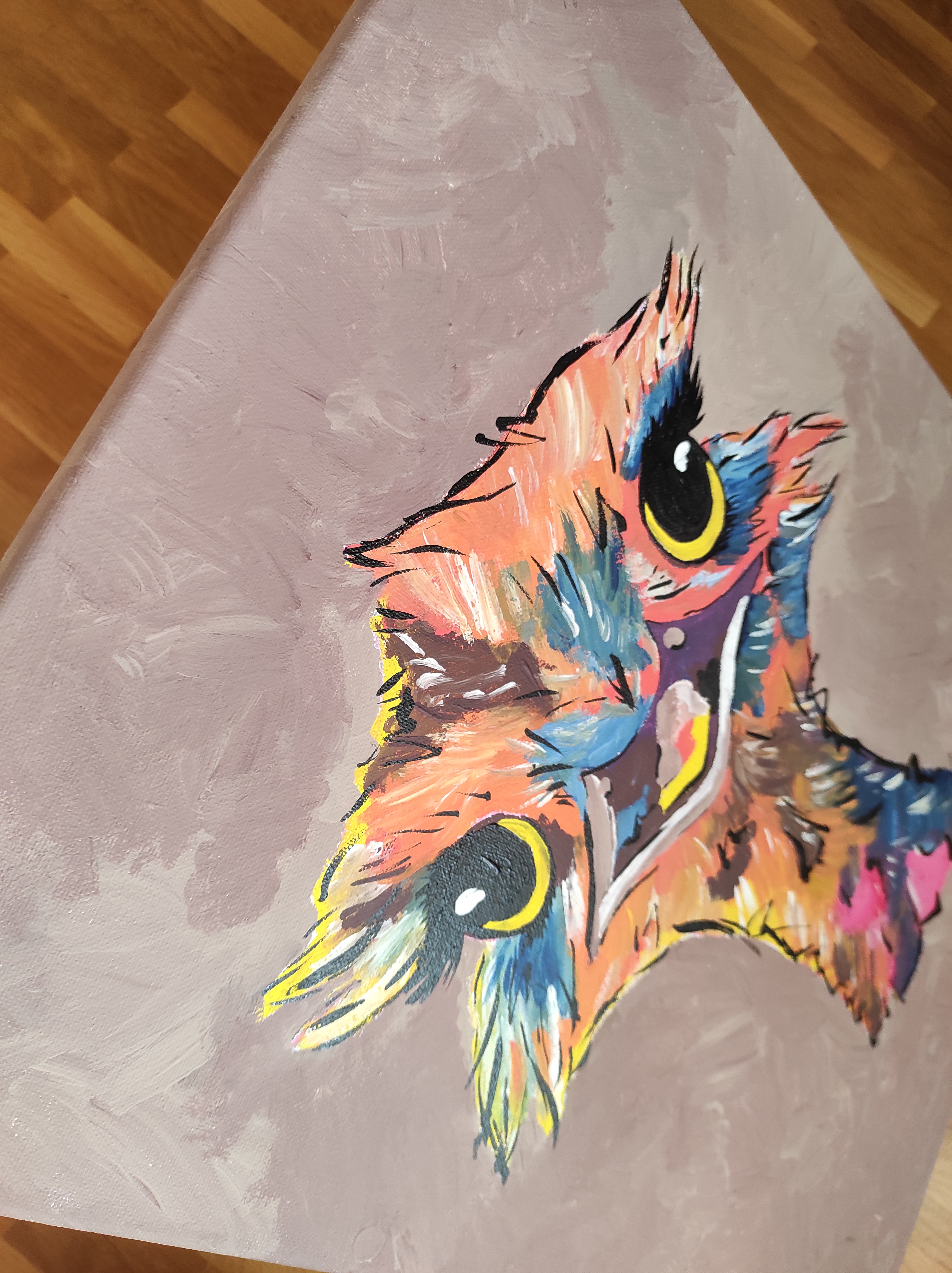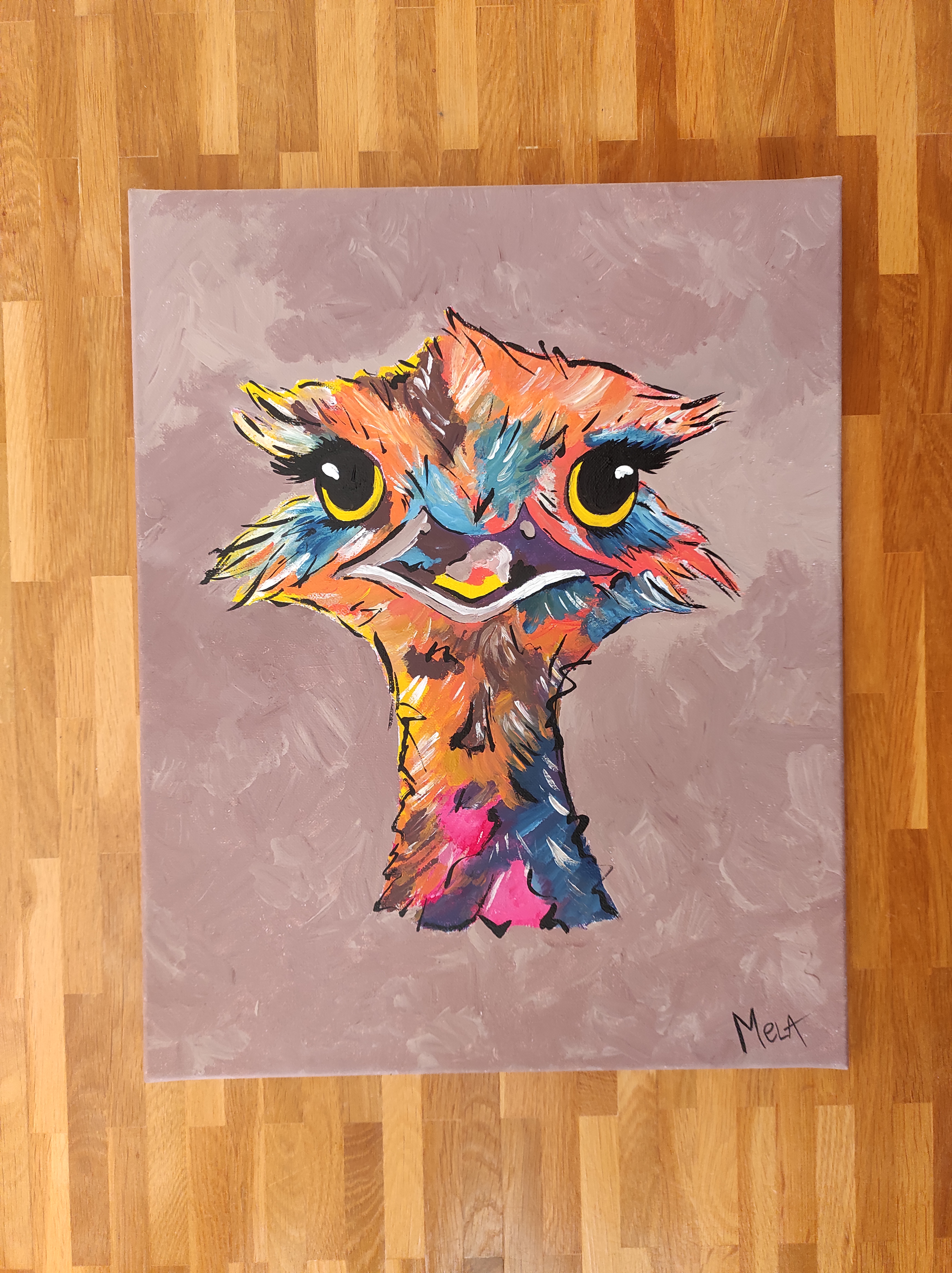 BIRDY zeigt ein modernes Profil des Vogel Strauß. Die bunten Farben stehen in starkem Kontrast zu dem schlammfarbigen Hintergrund. Das Motiv wird durch kräftige schwarze und weiße Linien betont. Der Farbauftrag ist matt.
