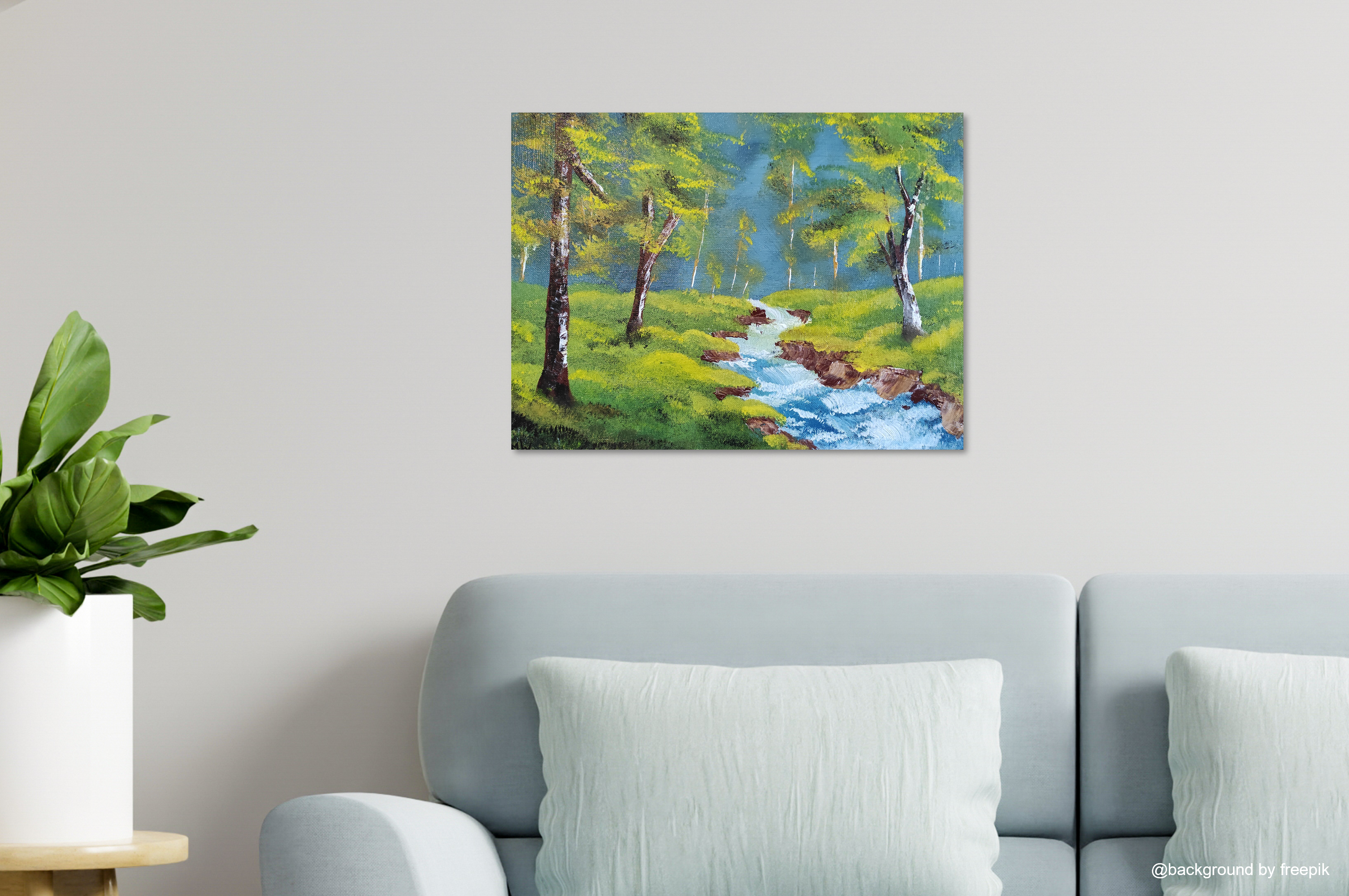 Das Bild ist auf einem 3,5 cm tiefen Keilrahmen aufgespannt und kann ohne zusätzlichen Rahmen aufgehängt werden. Die Seitenränder der Leinwand sind koloriert.