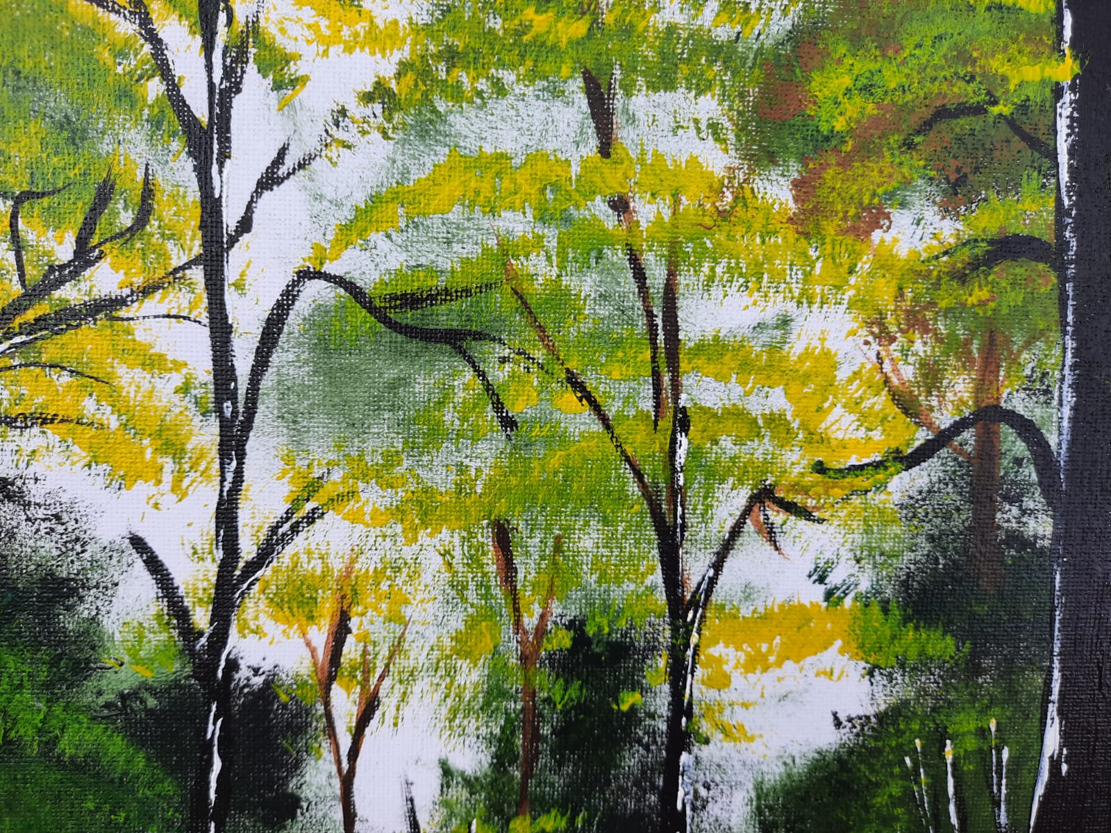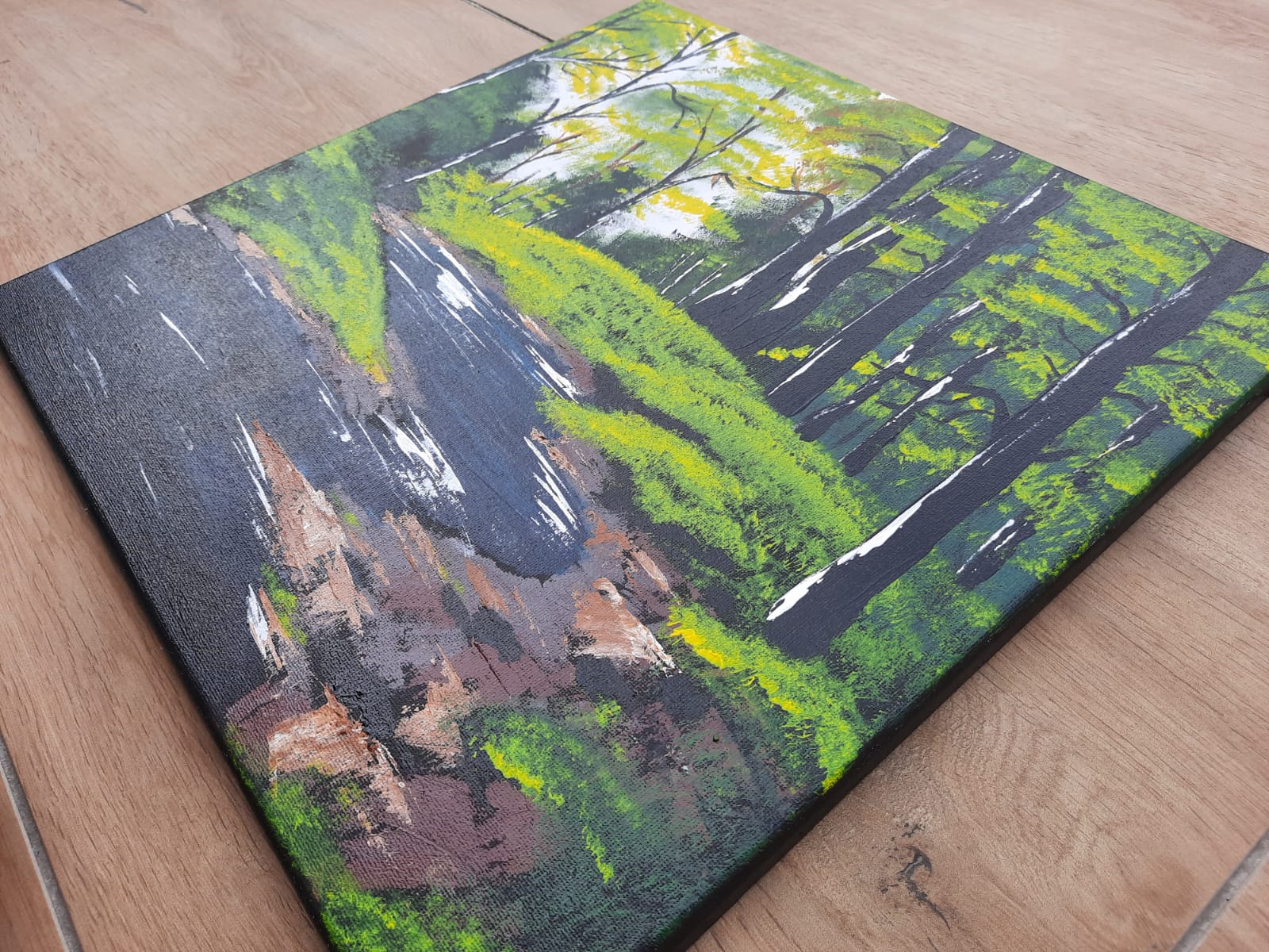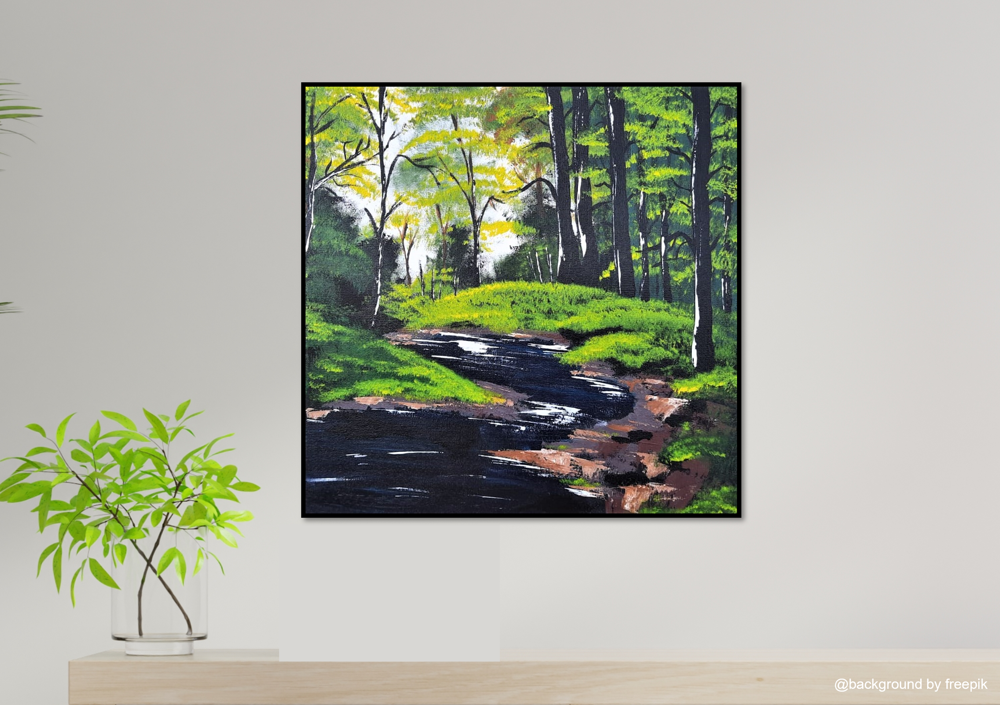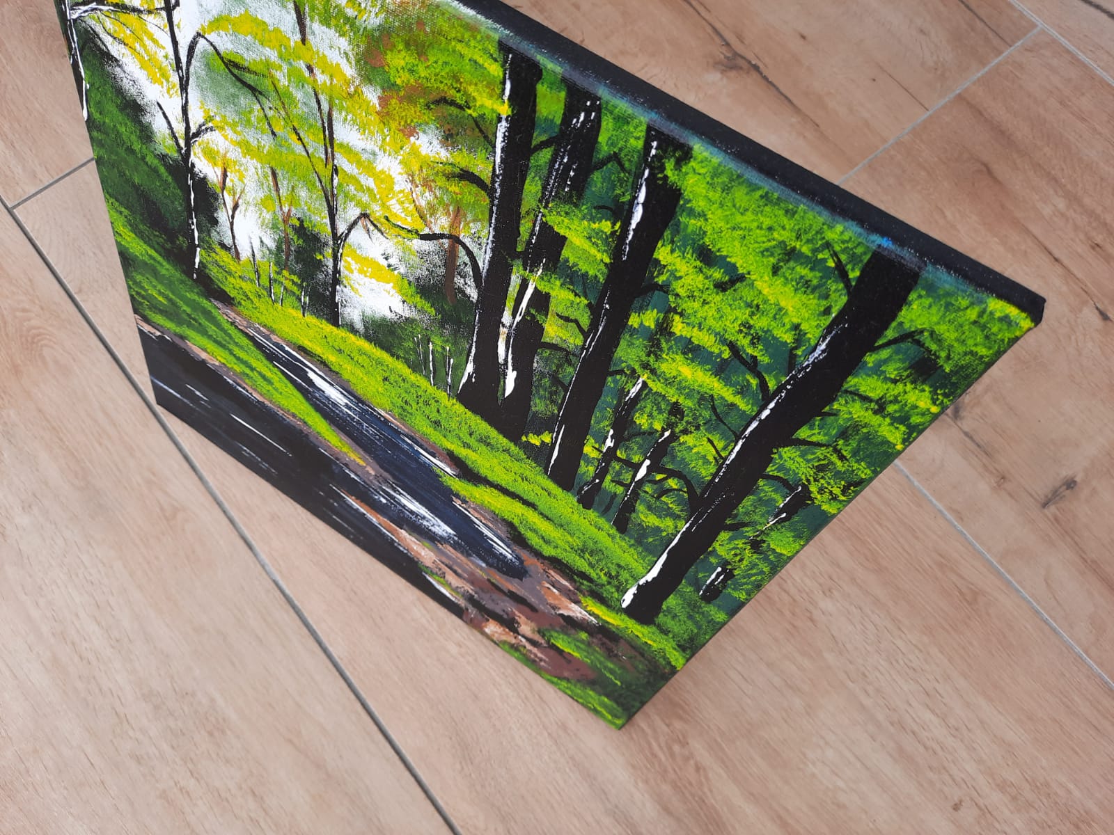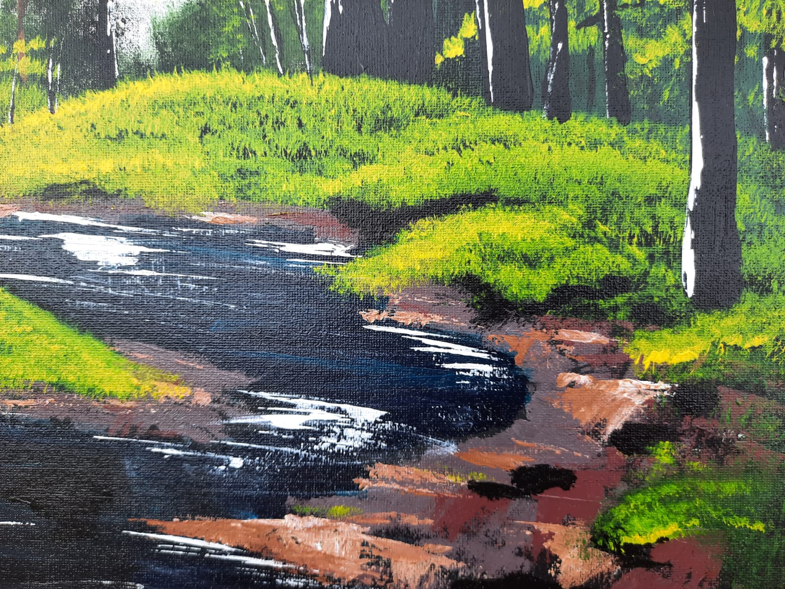Für das Kunstwerk FOREST STREAMLET wurde schwarze Ölfarbe als Basisschicht aufgetragen. Die Waldszene wurde mit farbintensiven Acrylschichten aus dem dunklen Hintergrund herausgearbeitet.