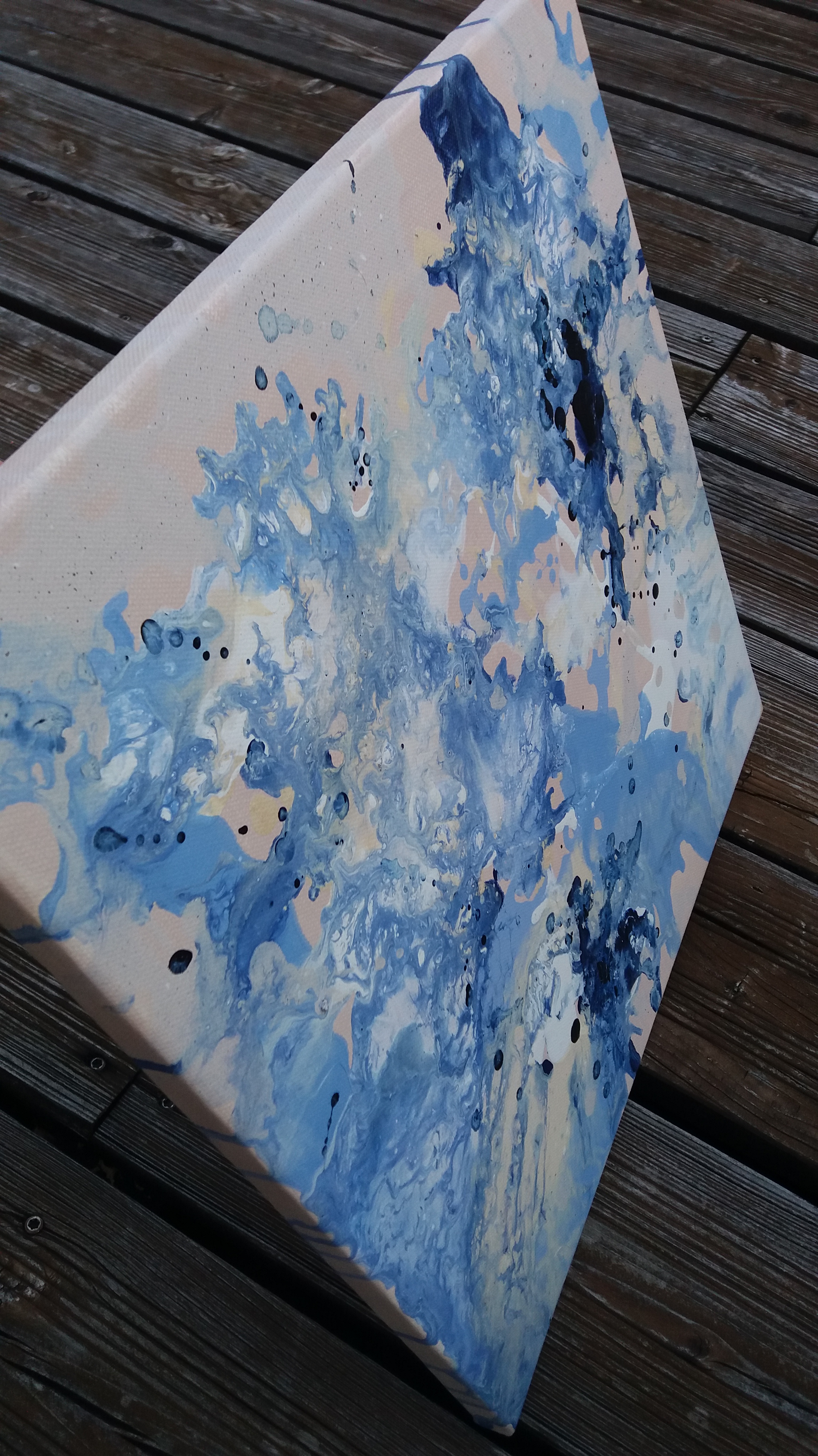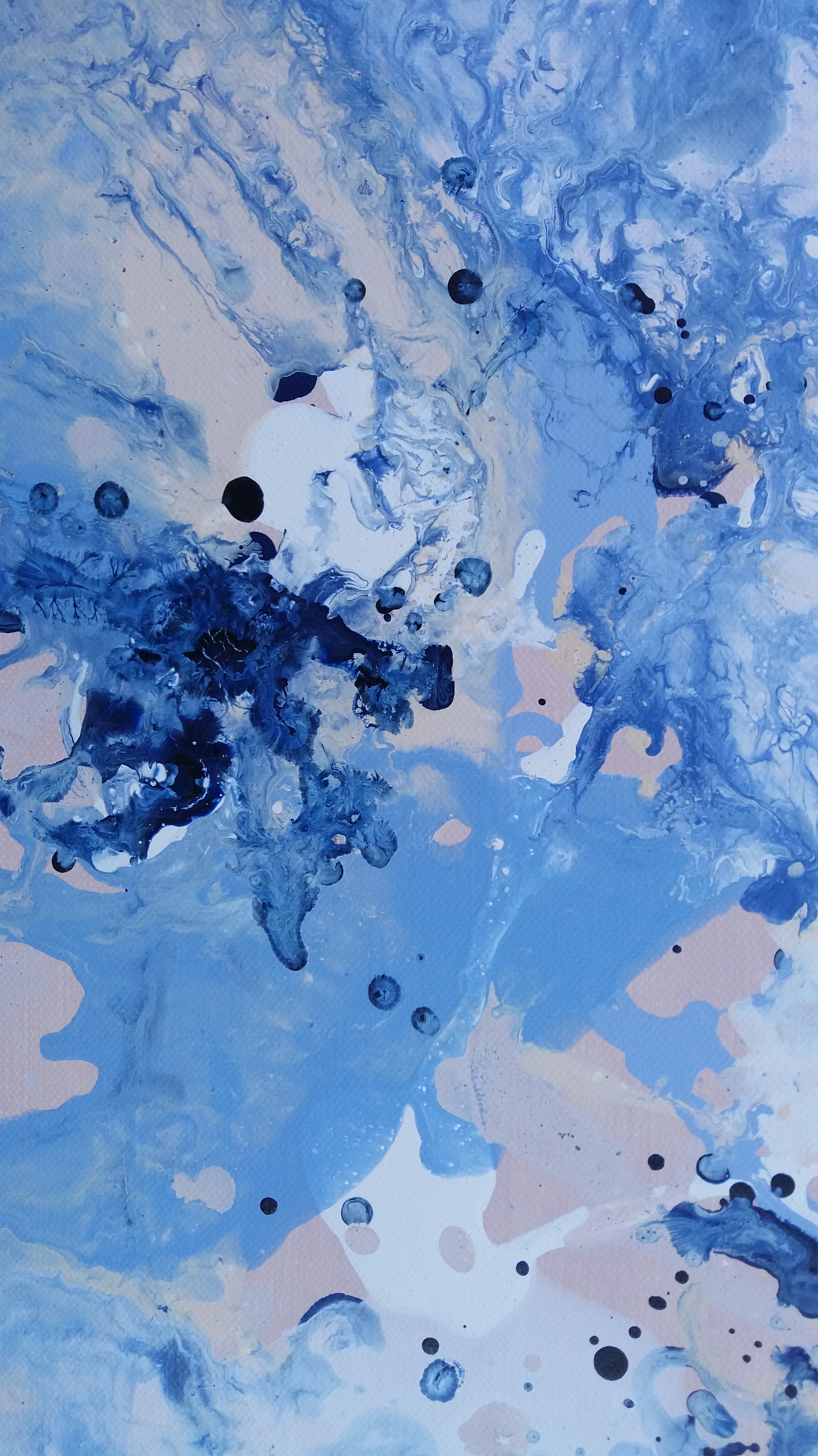 Zarte Blau- und Lilatöne vereinen sich auf einer warmen, mauve-stichigen Grundierung. Das Kunstwerk vermittelt Ruhe und Ausgeglichenheit. Weiße und dunkelblaue Farbverläufe schaffen Akzente.