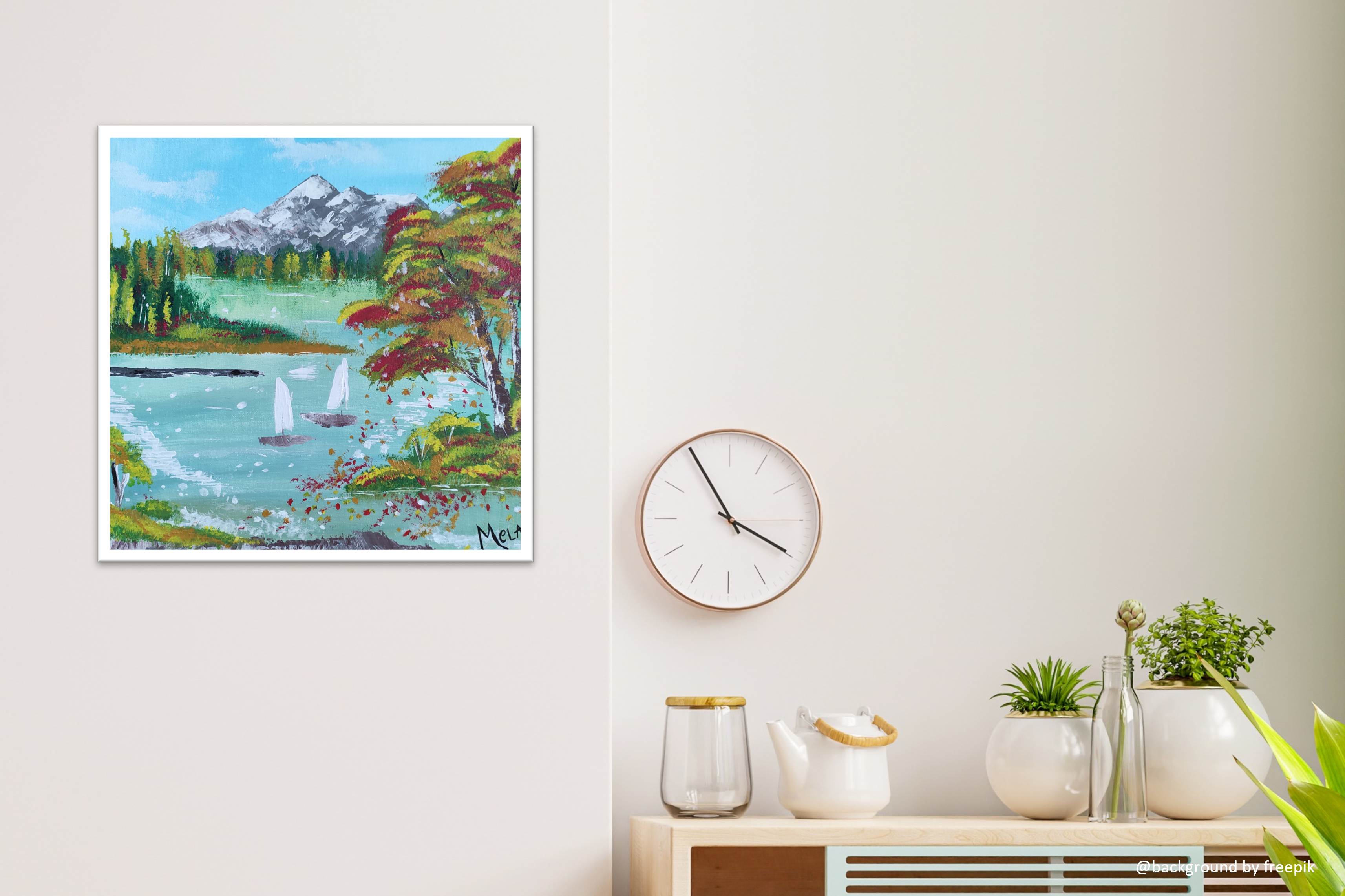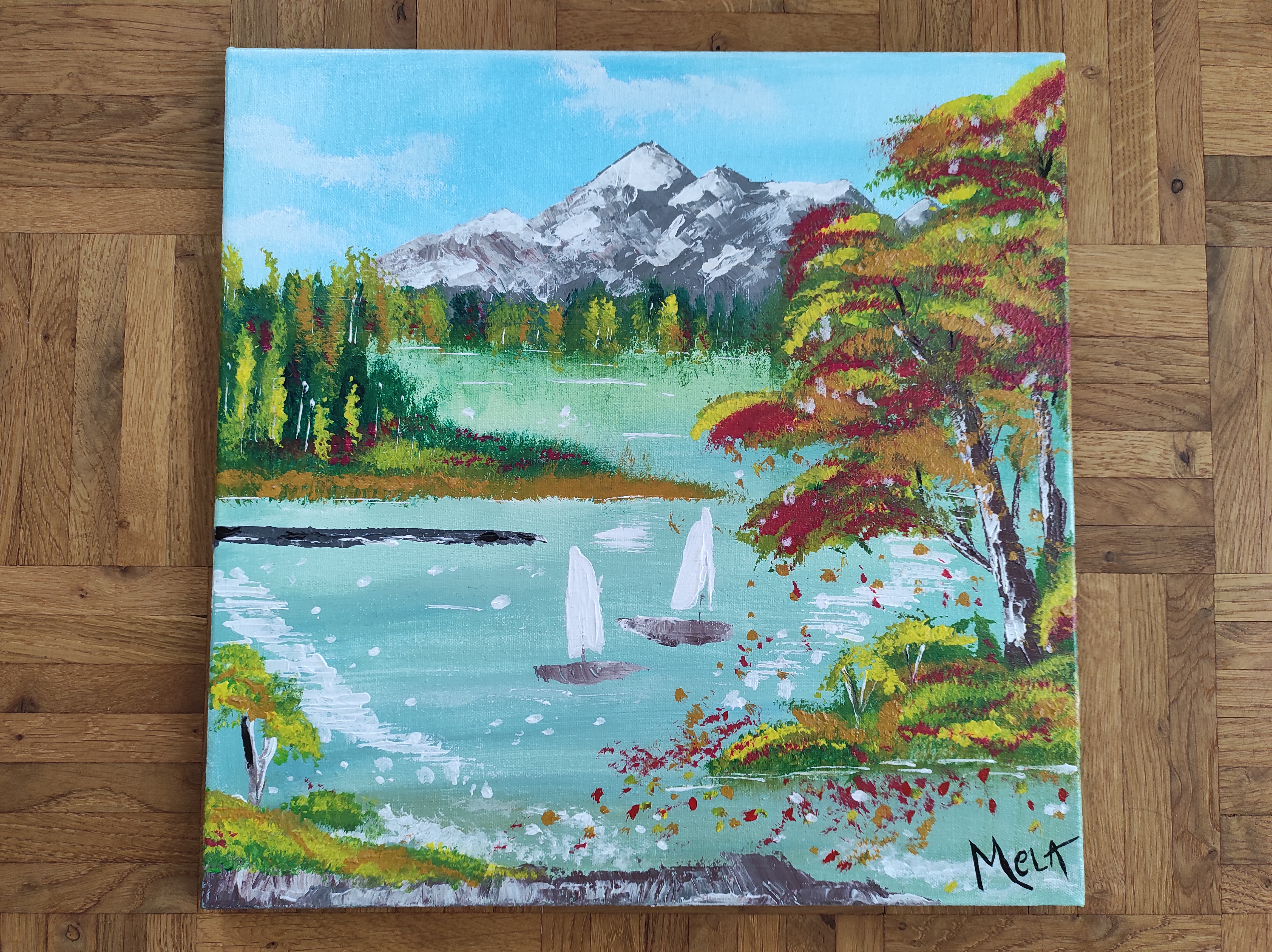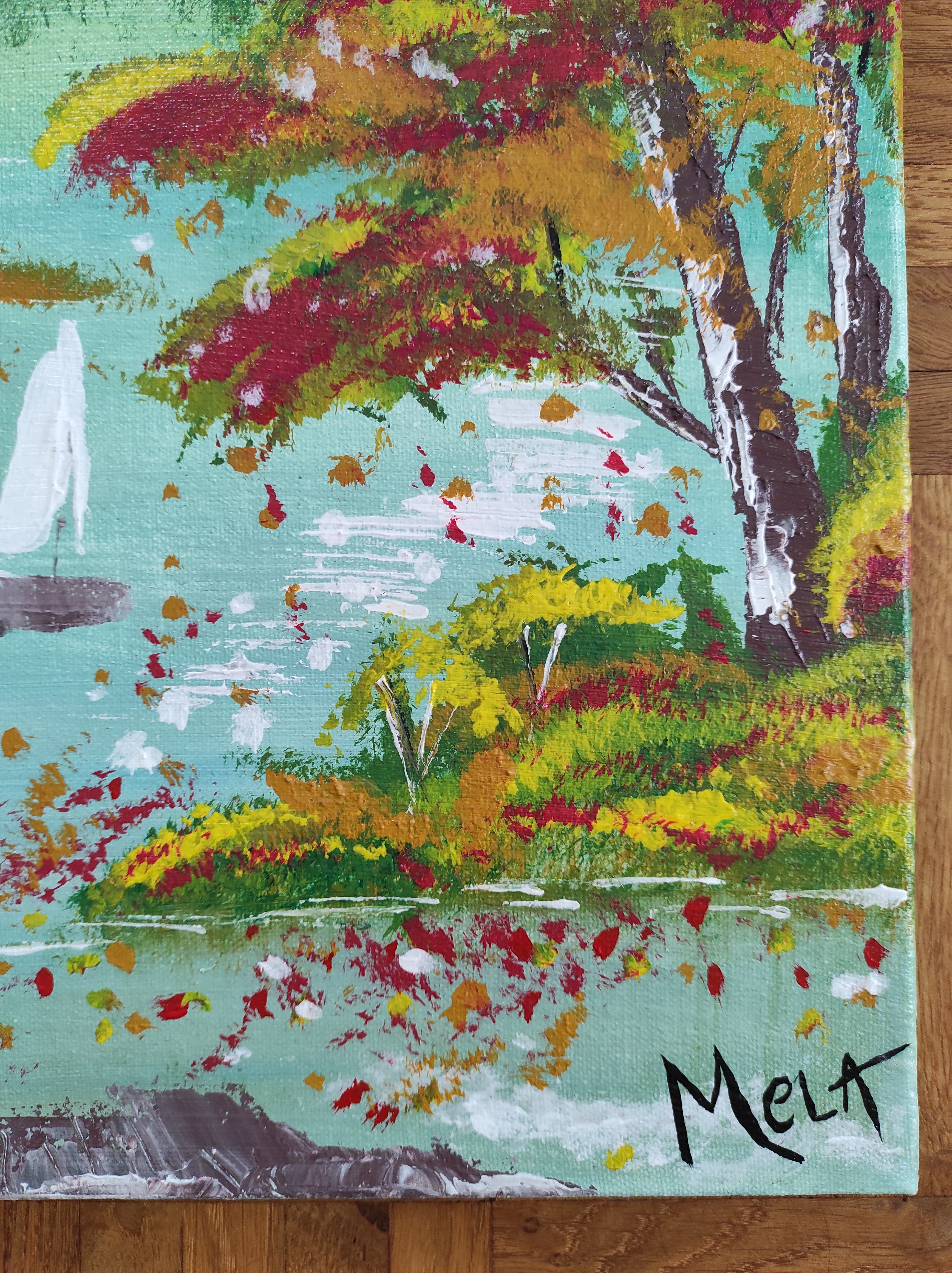 SAILING besticht durch seine Kombination aus pastellfarbenem Wasser und Herbsttönen, welche mit verschiedenen Pinsel- und Spachteltechniken aufgetragen wurden. Das Bild wurde mit Glanzlack überzogen.