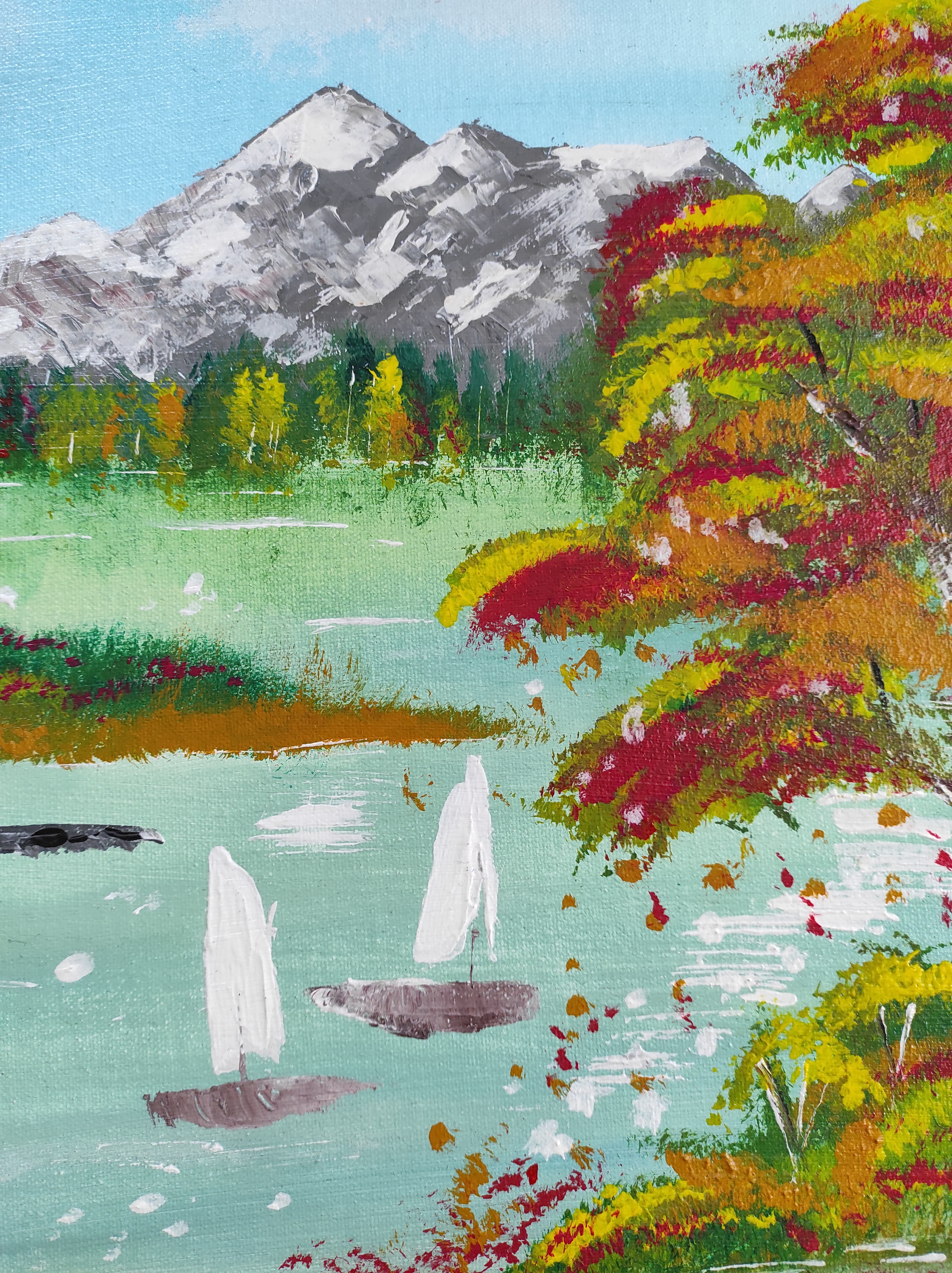 Zwei Segelboote in idyllischer Landschaftsszene. Eine verschneite Bergkette dominiert den Hintergrund. Herbstliche Bäume und Glanzpunkte in der Wasseroberfläche schaffen Kontraste im Motiv.